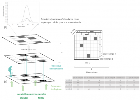 Les gestionnaires des espaces naturels souhaitent exploiter leurs bases de données opportunistes pour évaluer les dynamiques de biodiversité au sein des espaces qu’ils gèrent. Cependant, l’analyse de données opportunistes nécessite une attention particulière puisque l’effort d’échantillonnage est inconnu et hétérogène dans l’espace. De plus, les modèles de distribution d’espèce basés sur la niche ne prennent que rarement la dimension temporelle et n’explicitent pas les processus impliqués dans la dynamique écologique étudiée. En se basant sur les données opportunistes d’occurrence de papillons provenant du parc national des Écrins, nous avons développé un modèle spatio-temporel décrivant la dynamique d’émergence du stade adulte le long de gradients environnementaux. Le modèle permet de séparer les variations spatiales de l’effort d’échantillonnage de la distribution spatiale des espèces considérées ainsi que d’estimer des paramètres clefs de la dynamique d’émergence. Les estimations des dates de première émergence sont relativement précoces dans l’année, mais leurs tendances sont cohérentes. Les variables environnementales (altitude et forêt) ont un effet négatif sur l’abondance relative des espèces. L’intégration de données climatiques permettrait une meilleure compréhension de la variabilité spatio-temporelle des dates d’émergence ainsi que l’étude des capacités des espèces à s’adapter au changement climatique par la modification de leur phénologie et de leur aire de répartition.