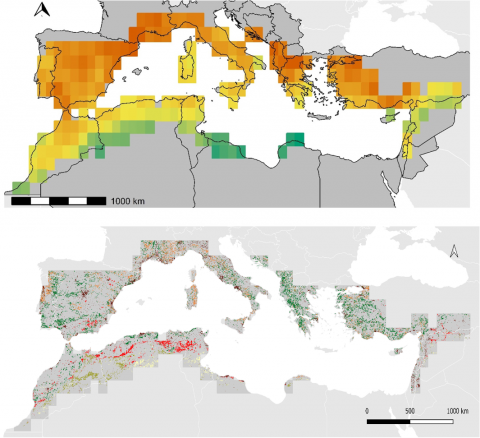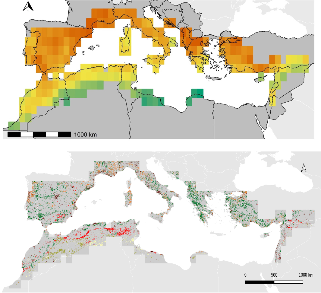 Les changements d'usage des sols figurent parmi les plus grandes menaces pour la biodiversité, mais l'évaluation de leur impact écologique est entravée par le manque de données pour de nombreuses régions du monde. Pour les oiseaux, les changements d'usage des sols peuvent signifier la perte ou la fragmentation de l'habitat, des changements dans la disponibilité des ressources et la perturbation des interactions biotiques ou des voies de dispersion. En conséquence, la taille des populations aviaires et la diversité des assemblages diminuent dans les zones soumises à l'urbanisation, à l'intensification agricole et à l'abandon des terres dans le monde entier. Cette menace est particulièrement sensible dans les hotspots comme le bassin méditerranéen, où se rencontrent des avifaunes de plusieurs origines biogéographiques, englobant de nombreux taxons endémiques, et des spécialistes peu résilients aux modifications de l'habitat. Ici, nous avons corrélé plusieurs facettes de la diversité taxonomique et fonctionnelle des oiseaux à une classification fine des changements d'affectation des terres, afin d'identifier les zones prioritaires nécessitant un échantillonnage protocolé des communautés aviaires dans une perspective de conservation. Pour cela, nous avons calculé la richesse spécifique, la richesse fonctionnelle, l'originalité et la spécificité de 211 assemblages d'oiseaux sur la base des données d'étendue d'occurrence des oiseaux pour 279 espèces et 10 traits écologiques. Nous avons utilisé un modèle de régression spatialisé pour corréler les modèles de diversité des oiseaux avec les gradients bioclimatiques et les changements d'utilisation des terres entre 1992 et 2018, évalués à partir d'un regroupement non supervisé sur des données de résolution de 2 km. Nous avons montré que les assemblages d'oiseaux riches en espèces sont soumis à l'intensification agricole, tandis que les assemblages fonctionnellement diversifiés subissent principalement la désertification et l'abandon des terres. Malheureusement, la plupart de ces changements se produisent dans des zones où les relevés ornithologiques protocolés avec une résolution spatiale et temporelle suffisante font défaut. À la lumière de ces résultats, nous proposons la mise en place de programmes de surveillance des oiseaux ciblés principalement sur certaines parties de l'Afrique du Nord et du Levant, afin de permettre une évaluation au niveau régional de la menace posée par les récents changements d'utilisation des terres sur l'exceptionnelle diversité avifaunistique du bassin. Favoriser de telles évaluations à l'échelle régionale des congruences entre les menaces humaines et les centres de diversité est une étape préliminaire nécessaire pour une réponse pragmatique aux lacunes en matière de données et, finalement, pour définir des réponses appropriées pour éviter l'effondrement des assemblages aviaires.
