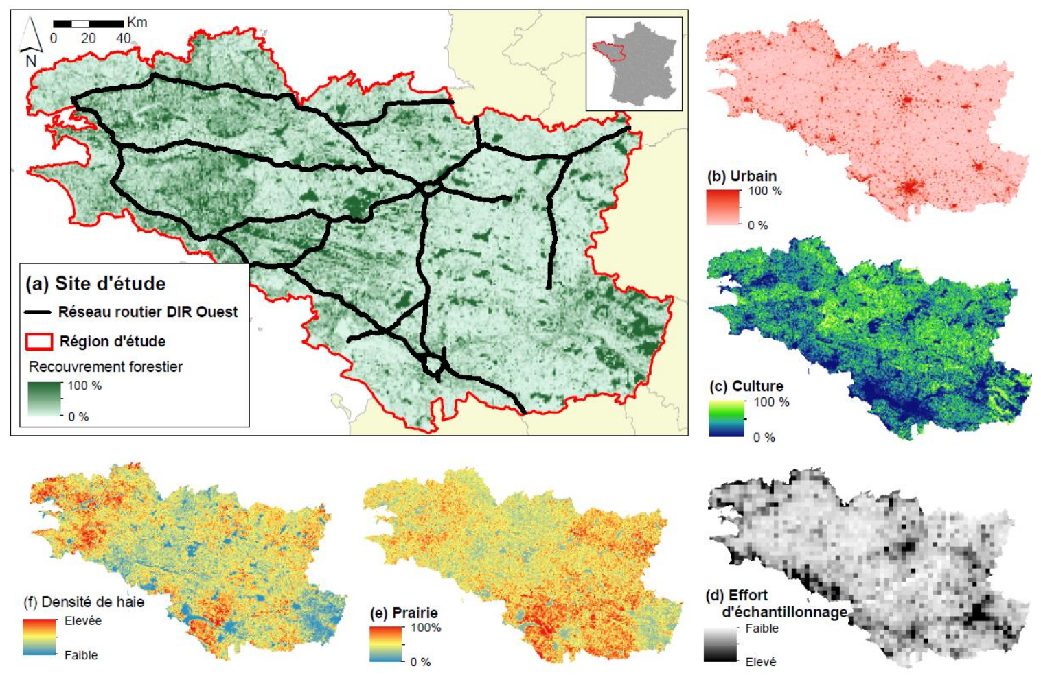 Les routes sont des infrastructures clés du dynamisme d’un territoire. Elles représentent cependant une menace pour la faune entraînant un surplus de mortalité lié aux collisions avec les véhicules. Ces collisions représentent également un enjeu de sécurité routière pour les automobilistes. Pour ces deux raisons, pouvoir prédire la distribution spatiale des collisions véhicule-animal est un enjeu majeur pour le développement d’infrastructures d’aménagement du territoire. Un modèle prédictif des patrons spatiaux de mortalité routière peut être envisagé comme une analyse de risque dans laquelle l'exposition correspond à la distribution géographique d'une espèce et le danger à des caractéristiques relatives à la route. Nous avons évalué les performances prédictives dans ce cadre en modélisant conjointement le patron de présence spatiale des chevreuils vivants ainsi que la mortalité routière de ceux-ci via l’approche INLA. Pour ajuster notre modèle, nous prenons en compte à la fois des données opportunistes géolocalisées fournies par des associations naturalistes locales concernant les animaux vivants mais également des données semi-protocolées concernant la mortalité routière collectées par les patrouilles routières de Bretagne, en France. L’ajustement et la qualité prédictive du modèle sont insatisfaisants mais la crédibilité des paramètres biologiques prédits, pousse à envisager une poursuite pour lever les barrages méthodologiques afin de pouvoir proposer un modèle prédictif des collisions véhicule-animal à portée régionale.